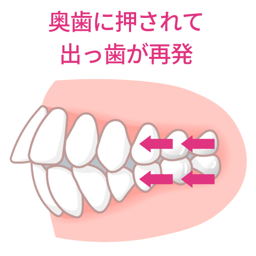 やがて前歯が斜めの奥歯に押し出されて、出っ歯が再発してしまう、というケースも決して少なくないのです。